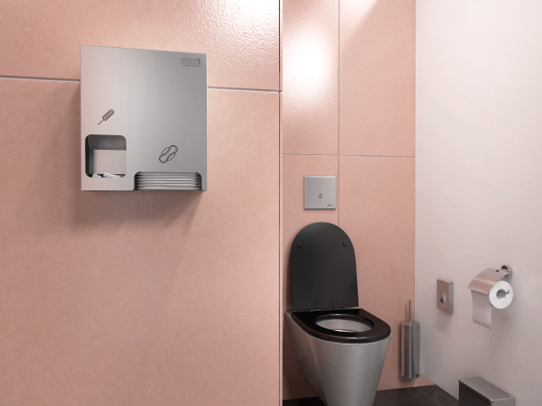 Rozsdamentes higiéniai eszköztartó SLZN 86 (matt rozsdamentes acél) és SLZN 86W (fehér komaxit), egyenként csomagolt betétek és tamponok számára.