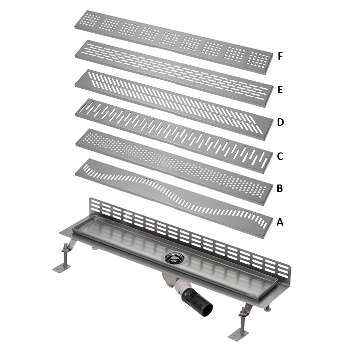 összefolyó, szifon, M10 csavarral ellátott szerelőlábak (4 db), rács eltávolító szerszám, vízszigetelő szalag, szerelőkészlet