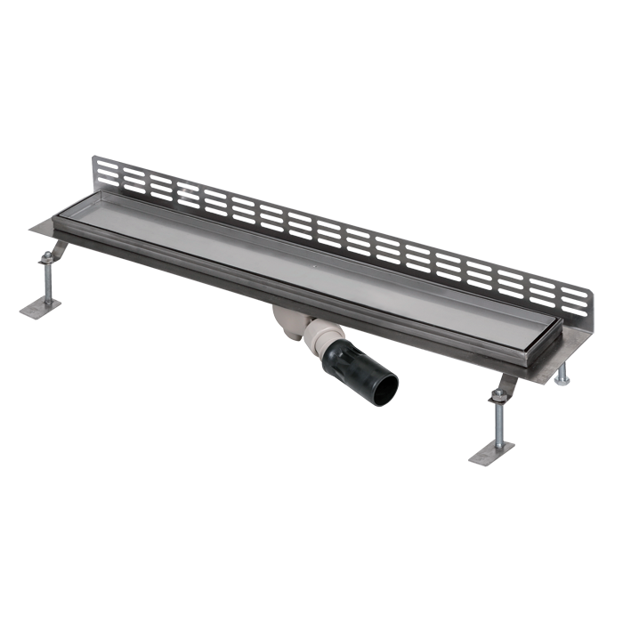SLKN 15 - Cikkszám: 69150 - összefolyó, rozsdamentes acél tálca (csempébe illeszthető, max. csempe magasság 12 mm - magasabb csempéhez rendelésre készíthető összefolyó), szifon, M10 csavarral ellátott szerelőlábak (4 db), rács eltávolító szerszám, vízszigetelő szalag, szerelőkészlet