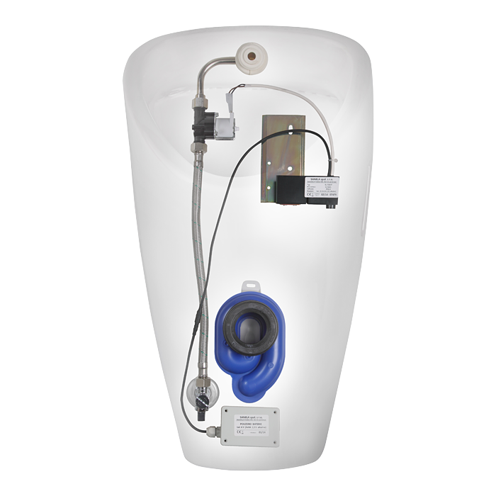 SLP 19RB - Supply No. 11197 - ceramic urinal with radar flushing unit on the mounting rail, electromagnetic valve, connecting hoses, angle valve with filter and check valve, inlet fitting with a rubber sealing, siphon, mounting set, paper drill template, 4 pcs. AA alkaline batteries 1,5 V, 2700 mAh with battery case