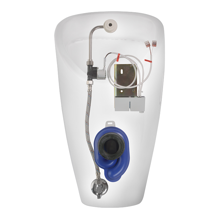 SLP 19RS - Supply No. 11195 - ceramic urinal with radar flushing unit on the mounting rail, electromagnetic valve, connecting hoses, angle valve with filter and check valve, inlet fitting with a rubber sealing, siphon, mounting set, paper drill template