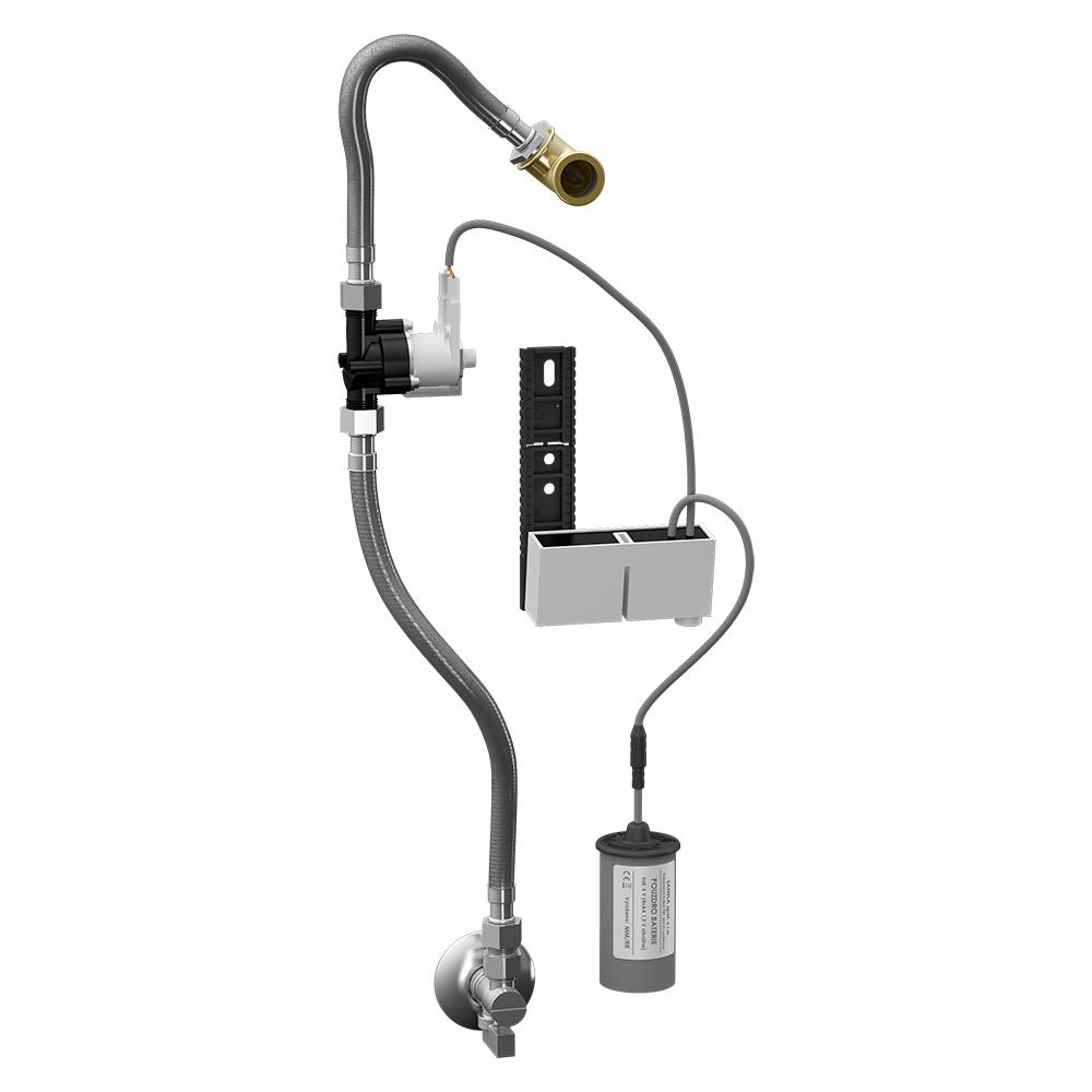 SLP 54RB - Cikkszám: 01541 - radaros öblítőegység Bluetooth modullal a szerelősínen, mágnesszelep, csatlakozó tömlők, szűrővel és visszacsapó szeleppel ellátott sarokszelep, gumitömítéses bemeneti csatlakozó, papír fúrási sablon, 4 db AA alkáli elem 1,5 V, 2700 mAh elemtartóval