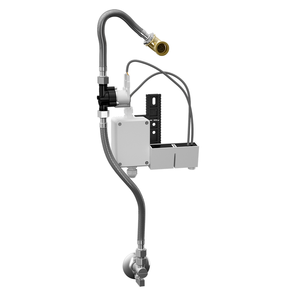 SLP 54RZ - Cikkszám: 01545 - radaros öblítőegység Bluetooth modullal szerelősínen, mágnesszelep, csatlakozó tömlők, szűrős és visszacsapó szelepes sarokszelep, gumitömítéses bemeneti csatlakozó, papír fúrási sablon, tápegység