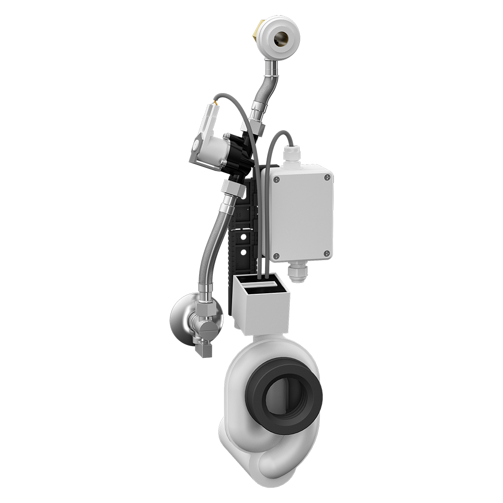 SLP 71RZ - Cikkszám: 11716 - radaros öblítőegység Bluetooth modullal a szerelősínen, mágnesszelep, szilikon dugó (1 db), csatlakozó tömlők, szűrővel és visszacsapó szeleppel ellátott sarokszelep, gumitömítéses bemeneti csatlakozó, szifon, papír fúrási sablon, tápegység