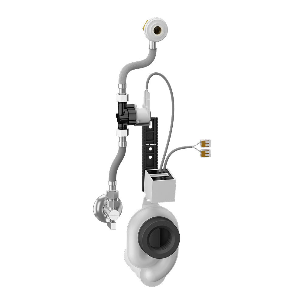 SLP 99Z - Supply No. 21994 - radar flushing unit including Bluetooth module on the mounting rail, electromagnetic valve, connecting hoses, angle valve with filter and check valve, inlet fitting with a rubber sealing, siphon, paper drill template, power supply