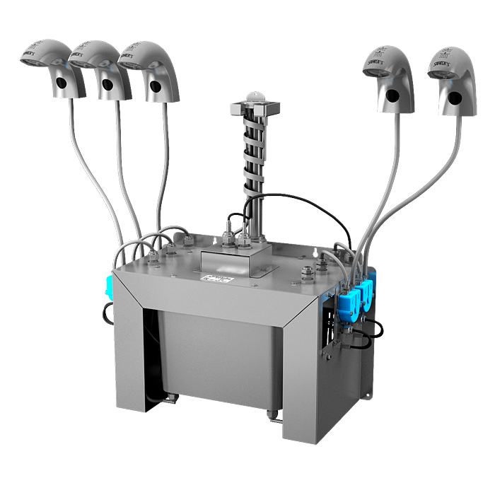 SLU 45M5 - Cikkszám: 03457 - csaptelep elektronikával (5 db), csatlakozó tömlők, elektromágneses szelep (5 db), központi szappanadagoló perisztaltikus szivattyúkkal folyékony szappanhoz és 6 l szappantartály, SLZ 01Z tápegység, SLD 03 távirányító