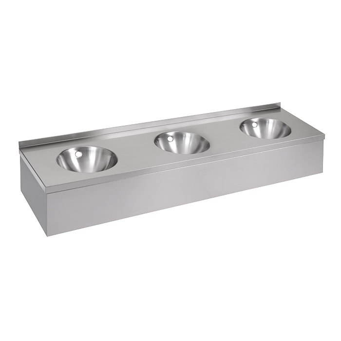 - SLUN 20P - falra szerelhető rozsdamentes acél hármas mosdó előlapos kivitelben és túlfolyó készlettel, 1800 mm hosszúságban