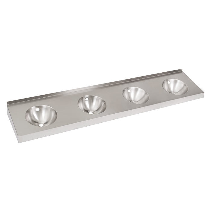 - SLUN 60 - rozsdamentes acél falra szerelhető többszemélyes mosdó 4 mosóhellyel és túlfolyó készlettel, 2400 mm hosszúságban