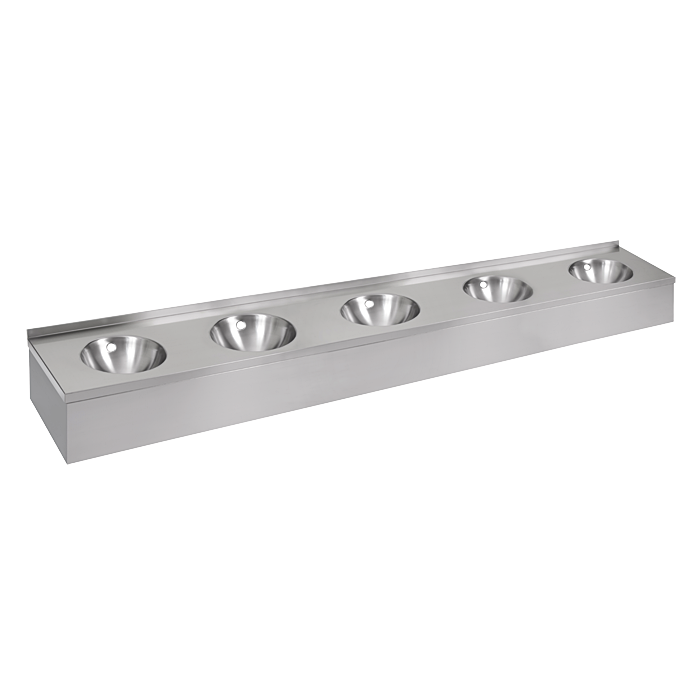 - SLUN 61P - rozsdamentes acél falra szerelhető többszemélyes mosdó 5 mosóhellyel, előlappal és túlfolyó készlettel, 3000 mm hosszúságban