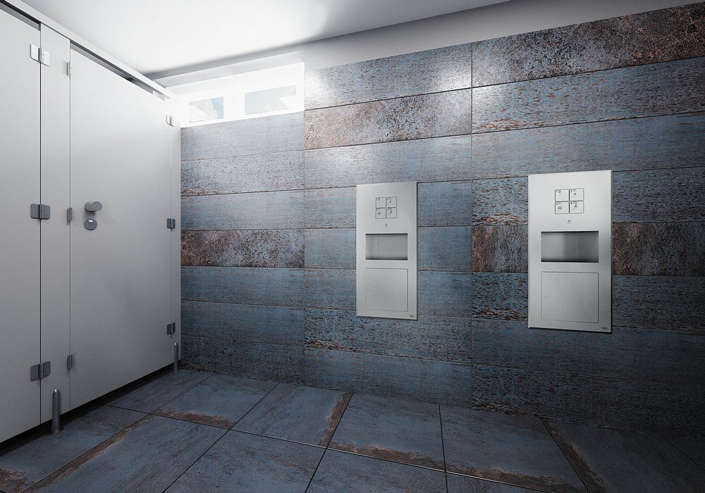- rozsdamentes acél süllyesztett többszemélyes mosdó integrált piezo elektronikával szappanadagolóhoz, vízkifolyóhoz és kézszárítóhoz egyben