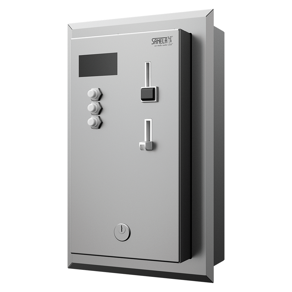 Recessed coin and token shower timer for four to twelve showers, 24 V DC, choice of shower by the machine, direct control
