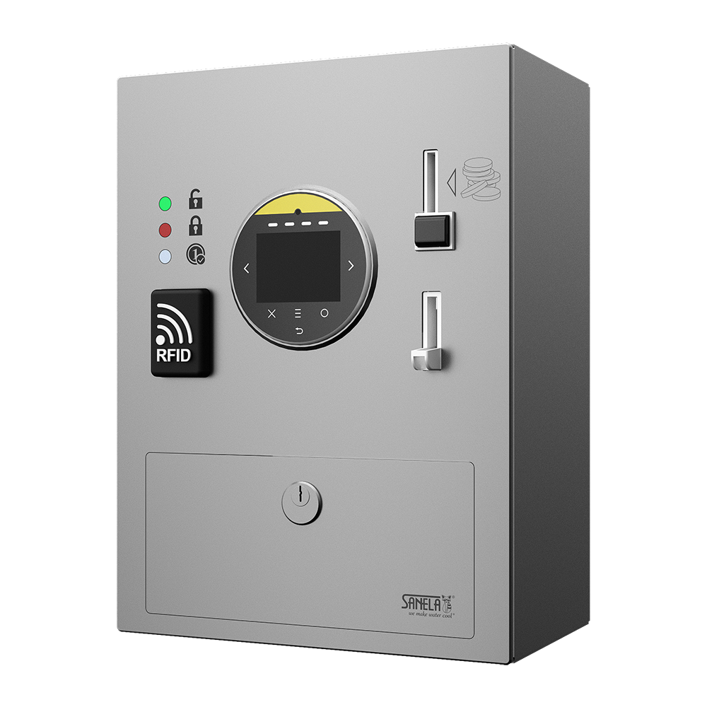 SLZA 43A - Cikkszám: 88438 rozsdamentes acél fizetőeszköz elektronikával, Bluetooth modullal, pénzgyűjtő dobozzal, érmetartóval, bankkártyaolvasóval, RFID token értékolvasóval, kulcskészlettel (2 db), SW ajtónyitóval