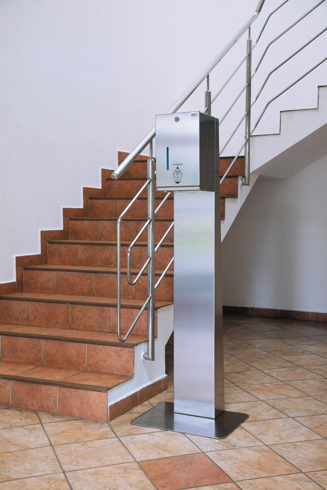 Automata rozsdamentes acél folyékony és gél fertőtlenítő, valamint szappan adagoló - falhoz állítható állvánnyal, 12 V-os akkumulátorral