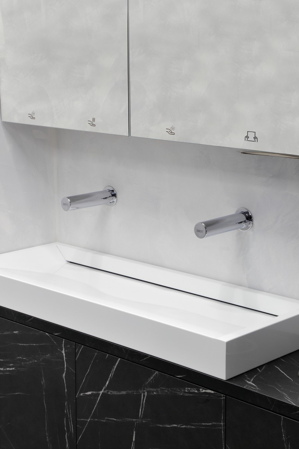 - egy adag szappan adagolódik, amikor a kezek az aktív tartományban vannak a tükör alatt (állítható 1,3 - 13 s között), alapértelmezett 2,6 s