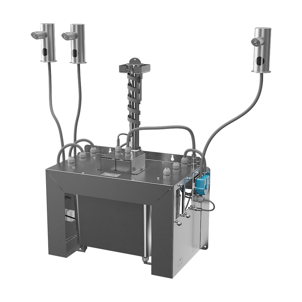 SLZN 91E3 - Cikkszám: 85913 - rozsdamentes acél kifolyó elektronikával (3 db), bekötőcsövek, központi szappanadagoló perisztaltikus szivattyúkkal folyékony szappanhoz és 6 l-es szappantartály, SLZ 01Y tápegység, SLD 03 távirányító