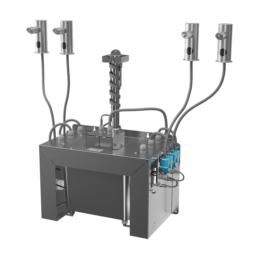 SLZN 91E4 - Cikkszám: 85914 - rozsdamentes acél kifolyó elektronikával (4 db), bekötőcsövek, központi szappanadagoló perisztaltikus szivattyúkkal folyékony szappanhoz és 6 l-es szappantartály, SLZ 01Y tápegység, SLD 03 távirányító